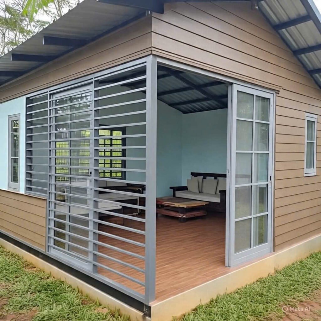 • Màu sơn ngoại thất: Thường là tông nâu gỗ ấm, phối khung cửa/khung thép sơn xám nhạt, tạo phong cách hiện đại pha chút rustic.