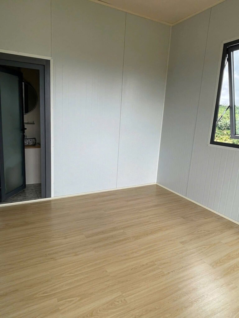 - Tường panel trắng, sàn gỗ chống ẩm.